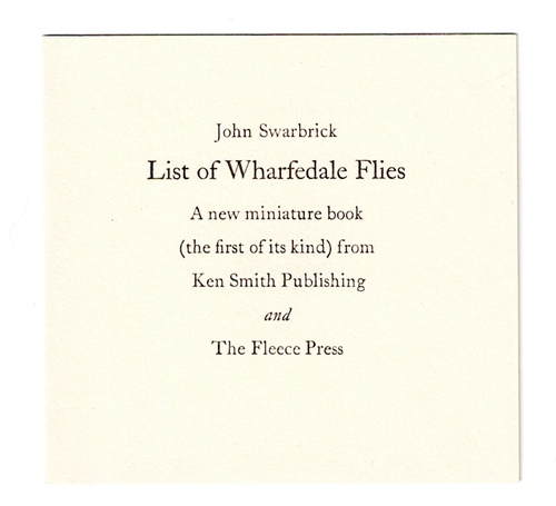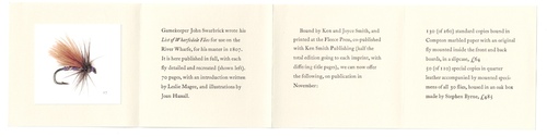 One of an edition limited to 1400 copies printed for the Press; 400 were printed for Ken Smith Publishing with the address amended on the final page. 74 x 78 mm. An eight page accordion-folded piece of off-white Mohawk text paper, printed letterpress in hand-set Caslon, with a tipped-in magnified photograph of a fishing fly printed by offset at J.W. Northend.