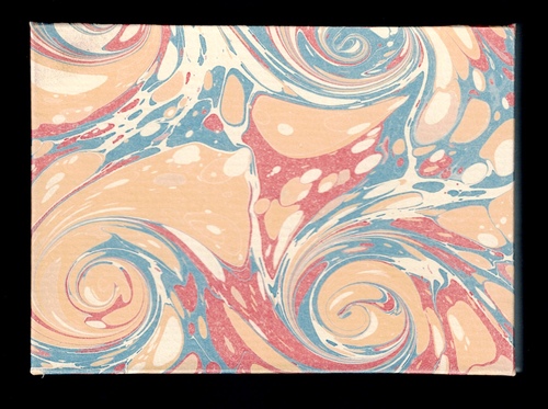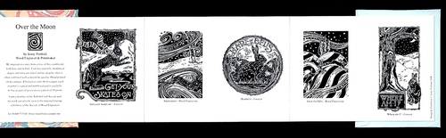 An accordion-fold miniature book with five images from original linocuts and engravings by Jenny Portlock. Upper cover with marbled paper over board, lower cover with blue paper over board and title label. 115 x 75 mm, pp. [6].
