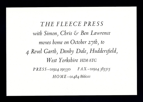 Announcement, single piece of card, 102 x 152 mm. One of an edition of 1,000 copies on three varieties of card, white, cream and oatmeal (this, white), printed letterpress in hand-set Arrighi. Marking the move from Wakefield to Denby Dale, although the workshop remained in central Wakefield at this time.