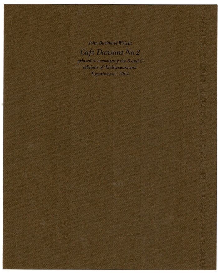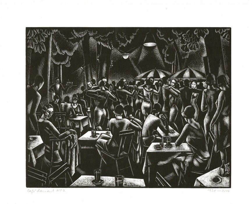 One of 90 standard copies with a print of Café Dansant No. 2, quarter bound in vellum using a patterned paper derived from an original design by the artist, and housed in a cloth-covered drop-back box, from a total edition of 300 copies. The paper is Magnani avorio Biblos and the type is Modern No. 7 set at Whittington by Peter Sanderson. The print is protected within a brown paper cover with black lettering to the front panel. Quarto. pp. [1-4] 5-71 [3 blank] [limitation page] [3 blank] with illustrations throughout.