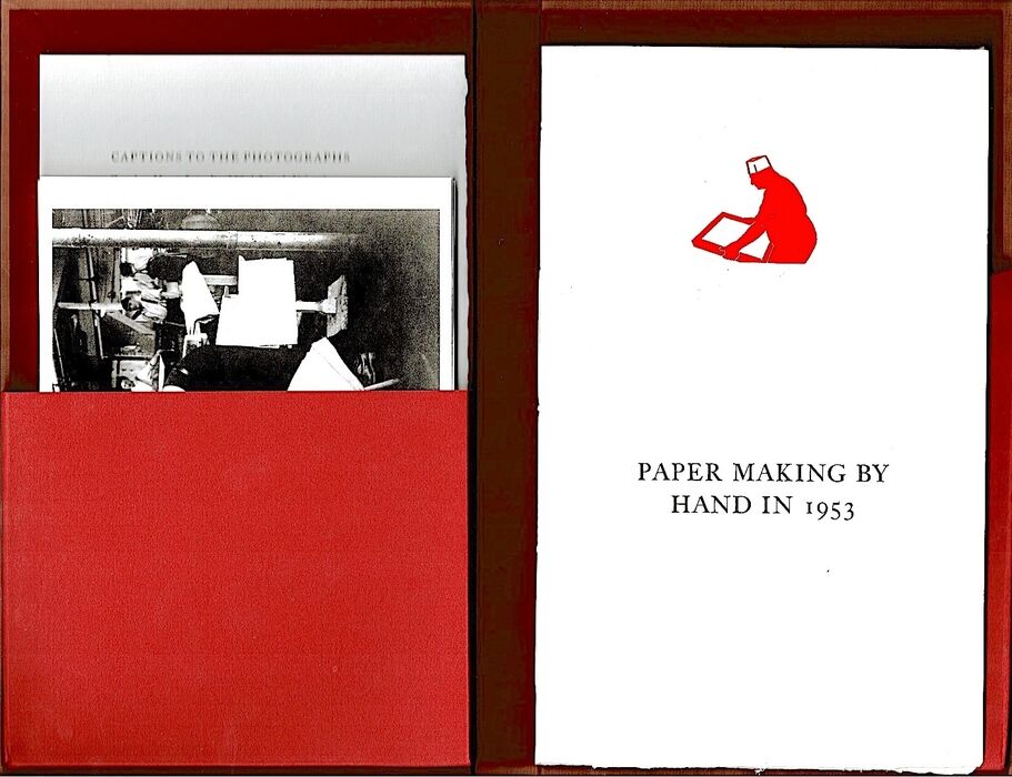 Copy number '85' of an edition limited to 130 copies, of which 100 were for sale. A reprint of a book first published in 1953 'to place on record an illustrated detailed description of a craft in which Great Britain has excelled for centuries.' The text was machine-set in 12 point Monotype Caslon, printed on Barcham Green Finale paper, wrapped in Chatham Vellum and held in a case cover in Antique Rose paper. The case cover, which has a paper label on the spine, also contains 16 indexed photographs of the paper-making process housed in one of two pockets, the other housing the book. 280 x 170 mm (case), 260 x 160 mm (book), pp. 20. A prospectus is loosely laid in.