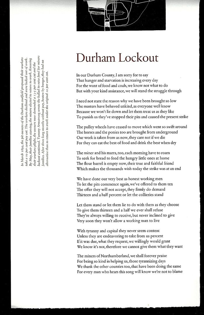 A broadsheet hand-set in Sabon-Antiqua and printed in three colours on Zerkall mould-made paper. The ballad was written by Tommy Armstrong 'The Pitman Poet of the Durham Coalfield', and originally published in 1892 to raise funds for striking miners and their families. 530 x 250 mm with an original screen print by Royal Scottish Academy artist, Alfons Bytautas. A broadsheet in Fine conditiuon, now in a clear, archival quality, protective display pocket.