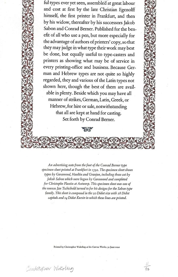 Copy number '11' of an edition limited to 40 copies, composed in the 20 Didot size with 28 Didot capitals and 14 Didot Kursiv for the explanatory note below the decorative frame. SIGNED by the printer-publisher. An advertising note from the foot of the Conrad Berner type specimen sheet printed at Frankfurt in 1592. This specimen sheet was one of the sources Jan Tschichold turned to for his designs for the Sabon type family. Printed in black, green and brown inks by Christopher Wakeling at his Corvus Works. 500 x 335 mm