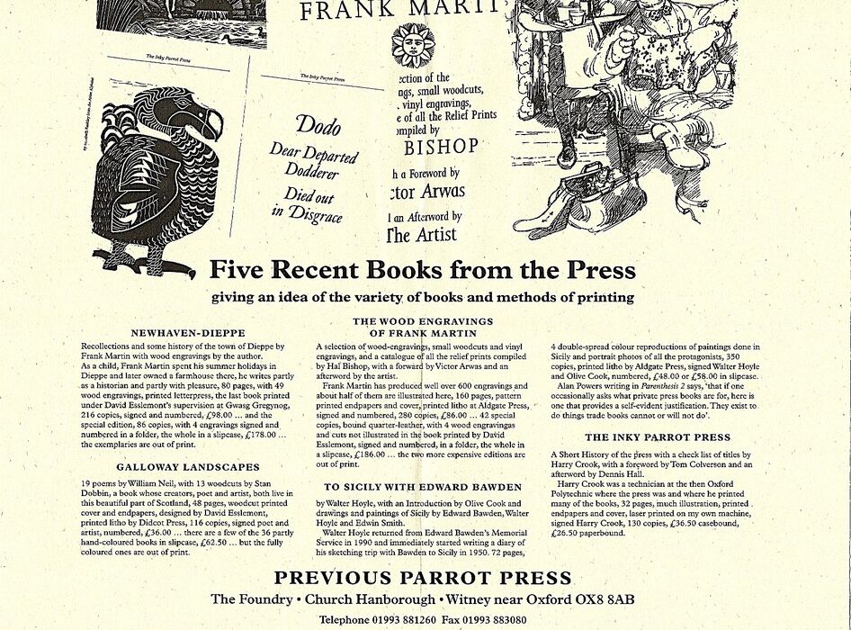 A poster advertising five recent (1996-1998) books published by Previous Parrot Press with illustrations taken from each - 'Newhaven-Dieppe', 'Galloway Landscapes', 'The Wood-engravings of Frank Martin', 'To Sicily with Edward Bawden' and 'The Inky Parrot Press, a Short History..'. Details the edition of each book and their authors and illustrators. 660 x 445 mm, folded in half three times.