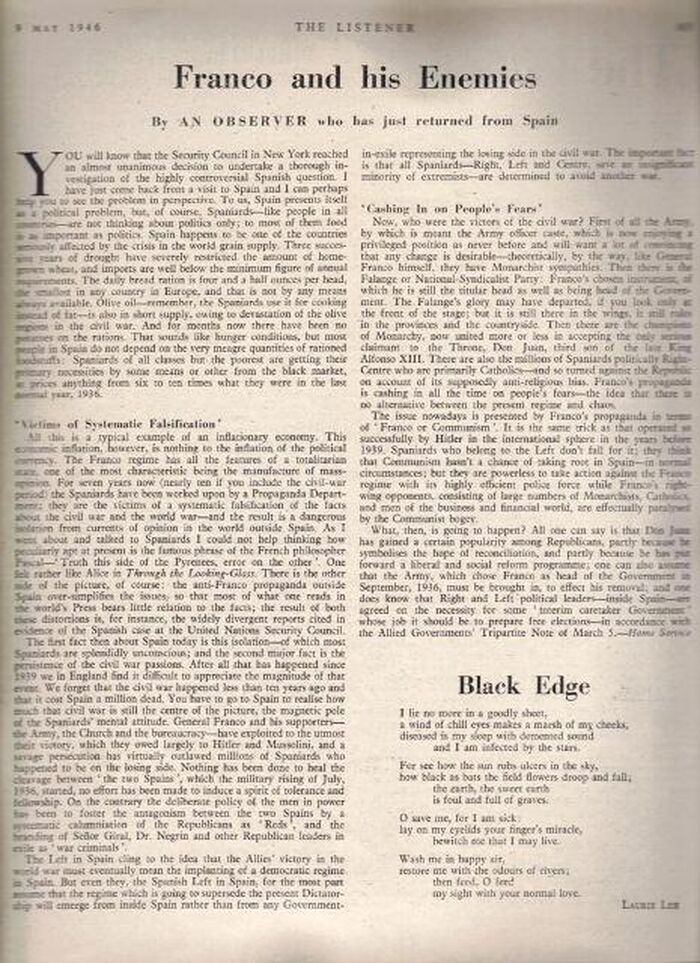 The Listener. Vol. XXXV No.904 published on May 9, 1946 and containing, at page 603, the poem 'Black Edge' [ 1 page ]. Original copy and first publication.