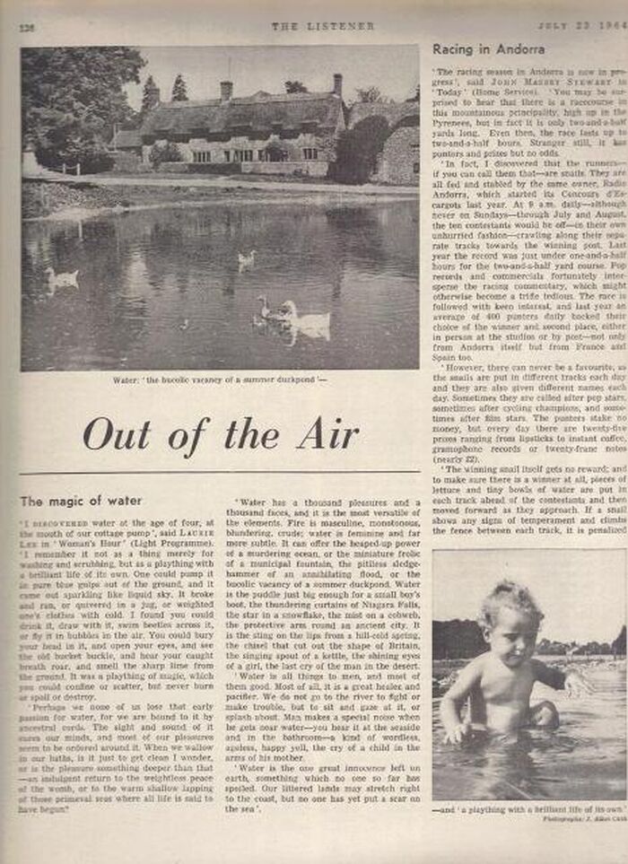 The Listener. Vol. LXXII No.1843 published on July 23, 1964 and containing, at page 126, the essay 'The magic of water' [ 1 page]. Original copy and first publication.