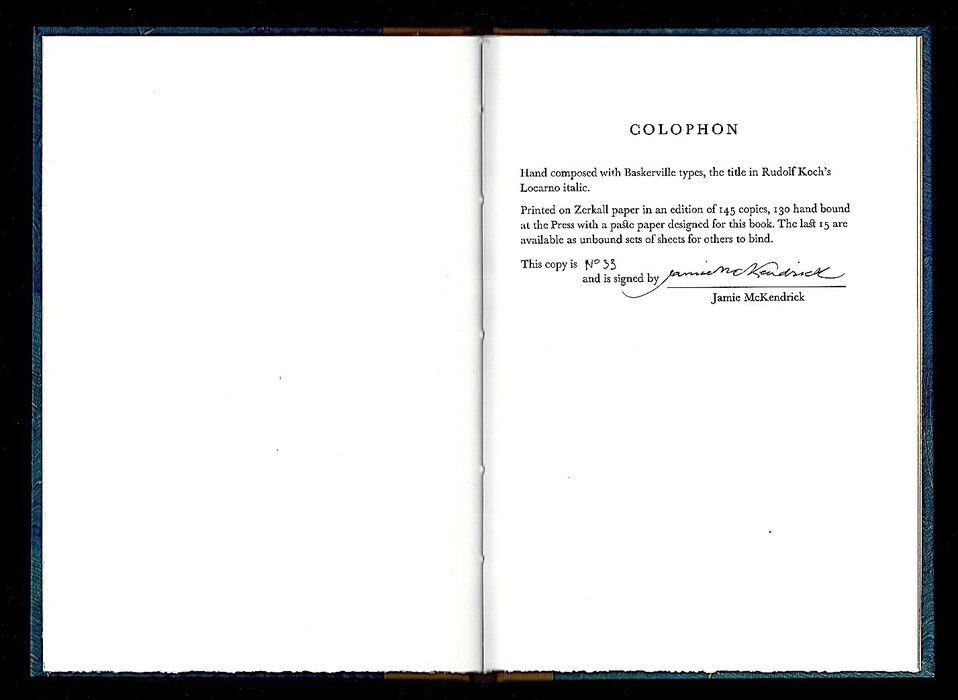 Copy number '35' of an edition limited to 130 hand bound, numbered copies (with 15 sets of unbound sheets also available), signed by the author on the Colophon. Hand composed with Baskerville types, the title in Rudolph Koch's Locarno italic. Printed on Zerkall paper. Quarter cloth binding, boards covered with paste paper designed for this book, yellow endpapers. Royal Octavo, 10" x 7", pp. [16].