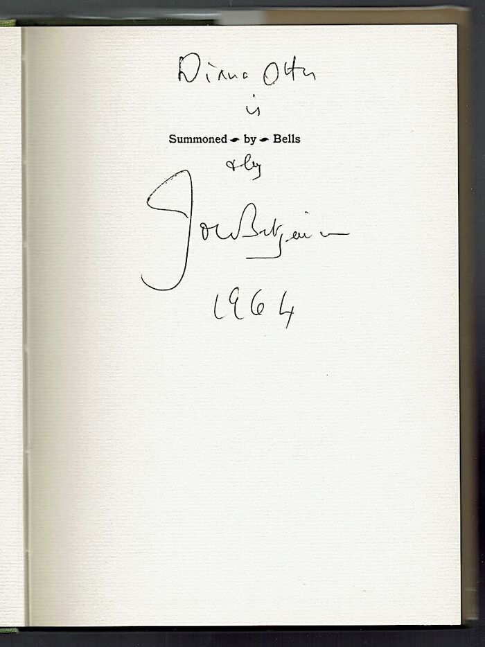 First Edition, first impression, INSCRIBED and SIGNED by the author on the half title page using the printed title as part of the inscription'Diane Otter is 'summoned by bells' by John Betjeman, 1964'. Publisher's green cloth patterned and embossed boards with bright gilt lettering to spine, patterned endpapers. Clear, removable, archival protective sleeve fitted to dust-jacket. Octavo, pp. [4], [1-2]3-112