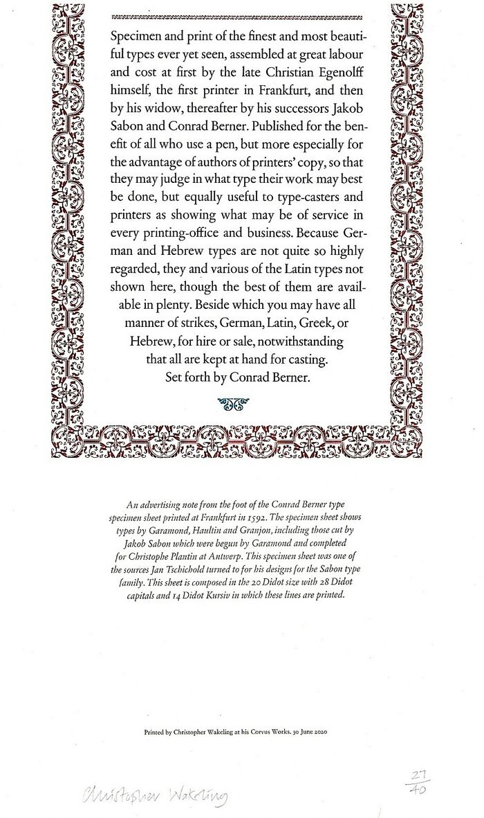 Copy number '28' of an edition limited to 40 copies, composed in the 20 Didot size with 28 Didot capitals and 14 Didot Kursiv for the explanatory note below the decorative frame. SIGNED by the printer-publisher. An advertising note from the foot of the Conrad Berner type specimen sheet printed at Frankfurt in 1592. This specimen sheet was one of the sources Jan Tschichold turned to for his designs for the Sabon type family. Printed in black, green and brown inks by Christopher Wakeling at his Corvus Works. 500 x 335 mm.