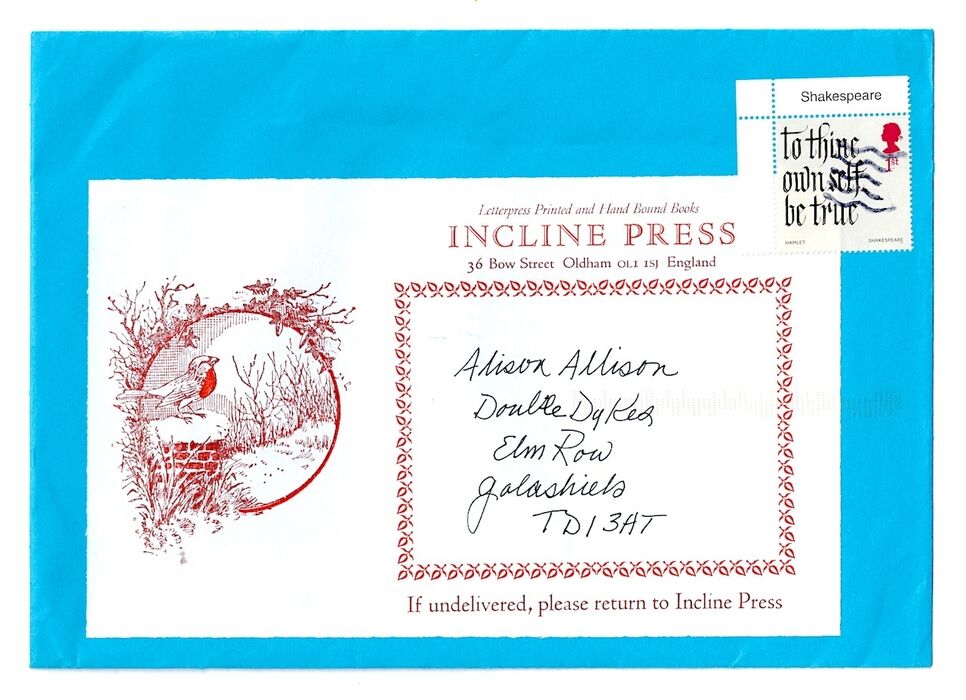 The 23rd New Year Booklet published by Incline Press, printed on Zerkall paper using Weiss type. Brown, illustrated and decorated card wrappers, sewn in white thread. 175 x 118 mm, pp. [16], with a frontispiece wood engraving by Andy English. This copy from the collection of Alison Allison, bookbinder of Galashiels, within the envelope sent to her by Incline Press.