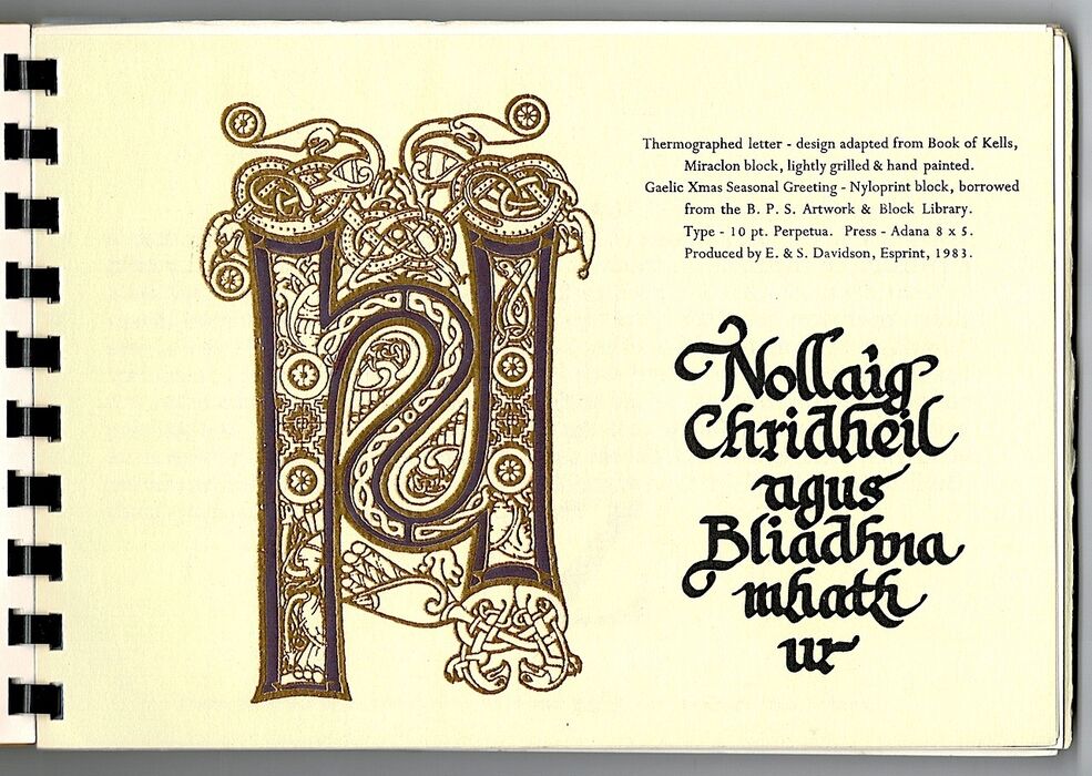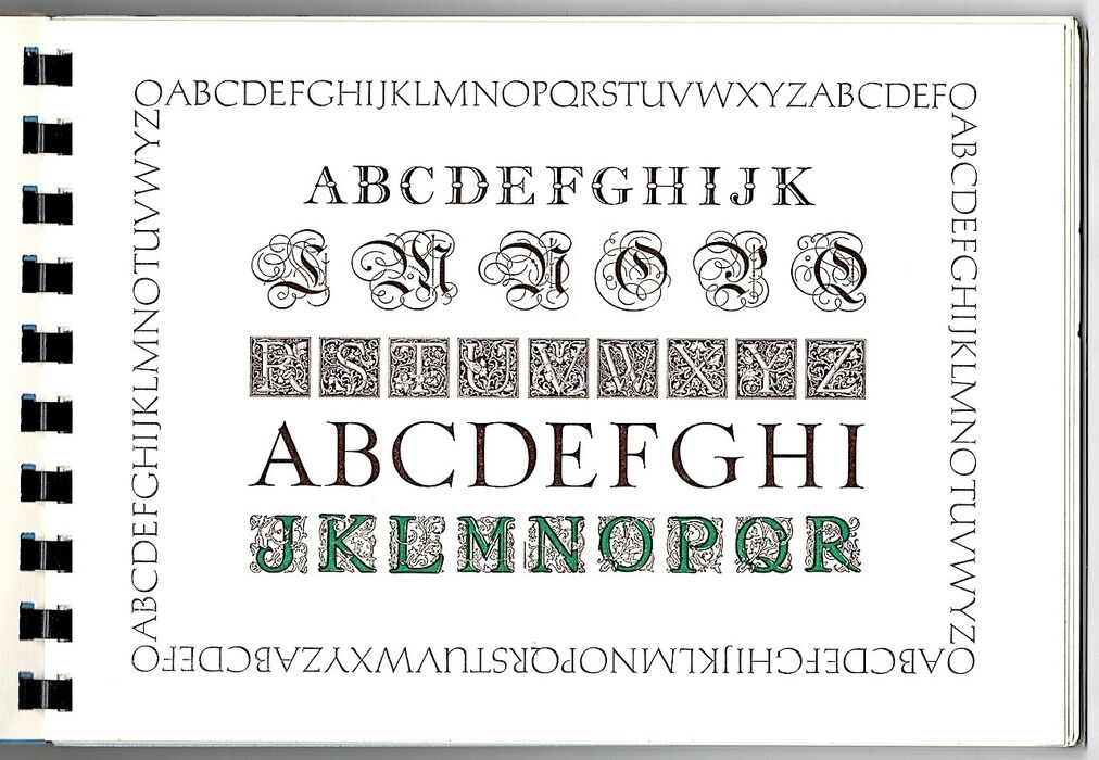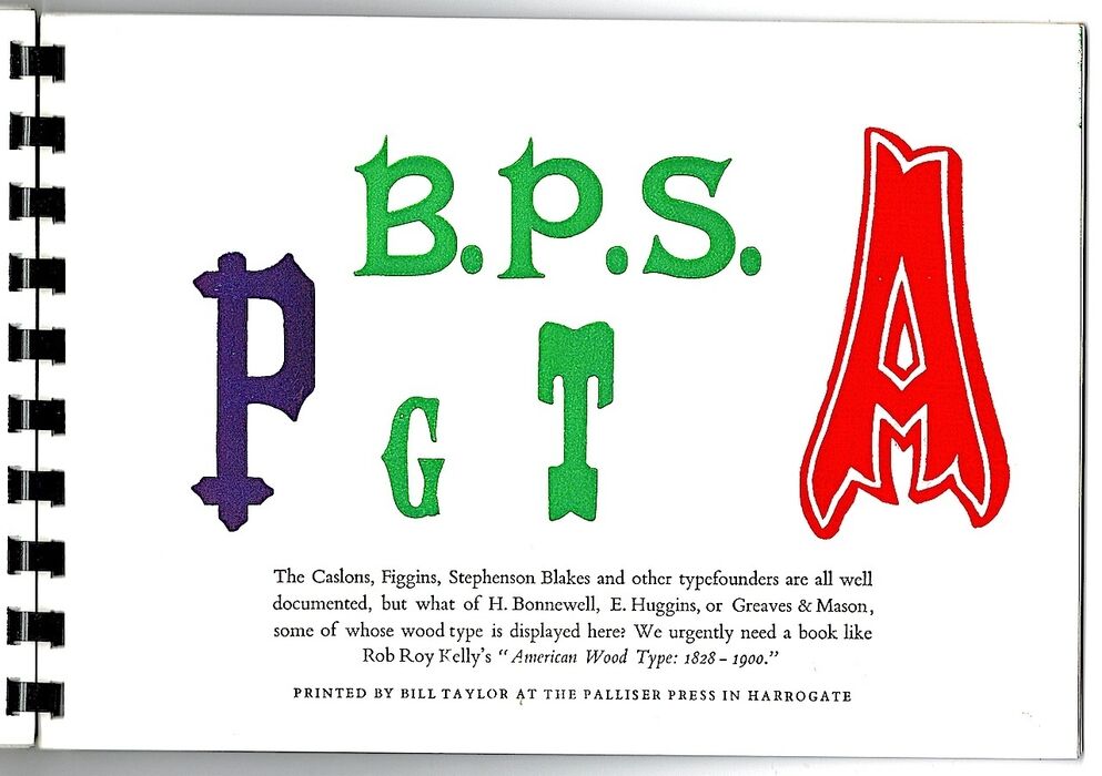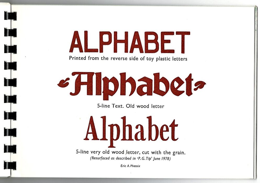 First Edition. One about 125 copies, each page or group of pages printed by one of twenty-one presses using various typefaces and illustrations on a variety of papers on the theme of alphabets. Plastic comb-bound with printed card covers by Claire Bolton of the Alembic Press. Oblong, 150 x 210mm, pp. [92]. With contributions by Greg Barnett, Claire Bolton (The Alembic Press), Conant Brodribb (Demi-Griffin Press), Michael Browning, E & S Davidson (Esprint), John Easson, John Eickhoff, B.K. Foster (Ashby Lane Press), Ursula Freeman (The Unidentified Flying Printer), Kenneth Hardacre (Kit-Kat Press), Benedict Heal, Alf Jones, E.D. Jordan, Alfred Lubran (Narbulla Agency), Carolyn Macey, Ruth & Peter Moore, John Munro (The Eagle Press), Eric Phoenix, Colin Smith (The Fledermaus Press), Eric Stevens, Bill Taylor (The Palliser Press).