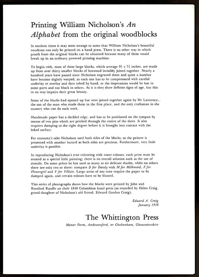 Copy number '197' of an edition limited to 300 copies (of which only copies numbered 1-150 accompanied the portfolios of plates). Signed by the author on the limitation page. Hand set in Caslon type and printed at Whittington Court on Rives mould-made paper by John and Rosalind Randle and Miriam Macgregor; bound by Pat Hicks at The Whittington Press. Printed mustard yellow sewn wrappers with illustrations of the alphabet blocks on the verso of the wrapper sheet. Folio, 340 x 260 mm, pp. [title page] [limitation page] [List of Plates in Portfolio] [Acknowledgements] [5-16], illustration on page 13. TOGETHER WITH a folded sheet with nine annotated black and white photographs "Printing William Nicholson's Alphabet from the Original Woodblocks" laid in.