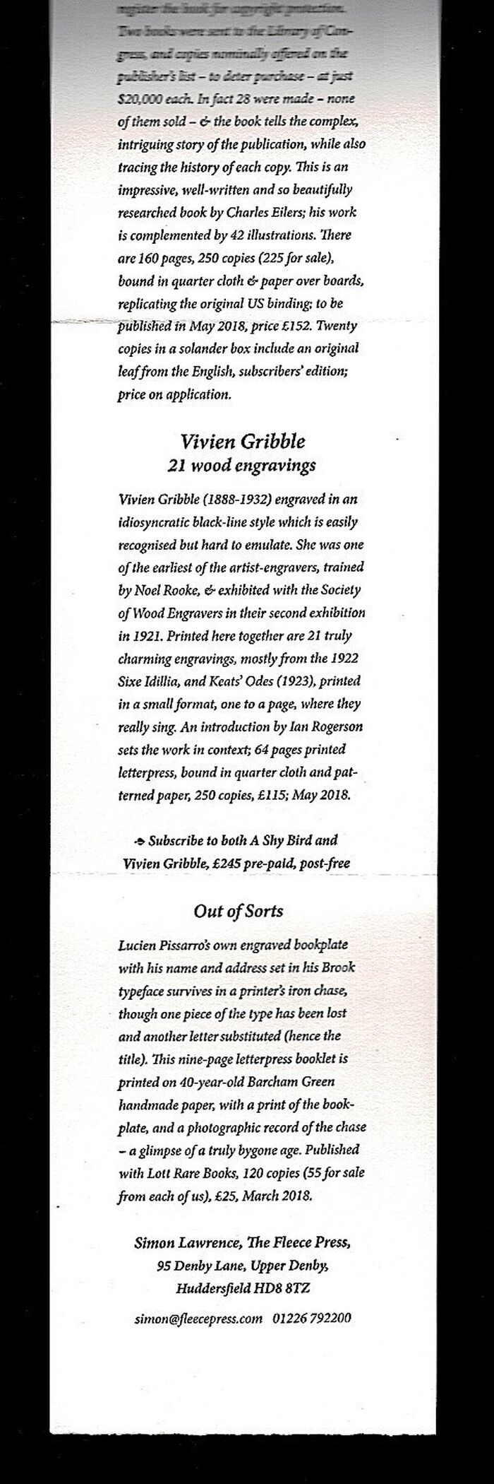 A prospectus promoting 'A Shy Bird', 'Vivien Gribble, 21 wood engravings' and 'Out of Sorts'. 18" x 3¾, folded twice by the publishers to produce a folded prospectus 7¼' x 3¾".