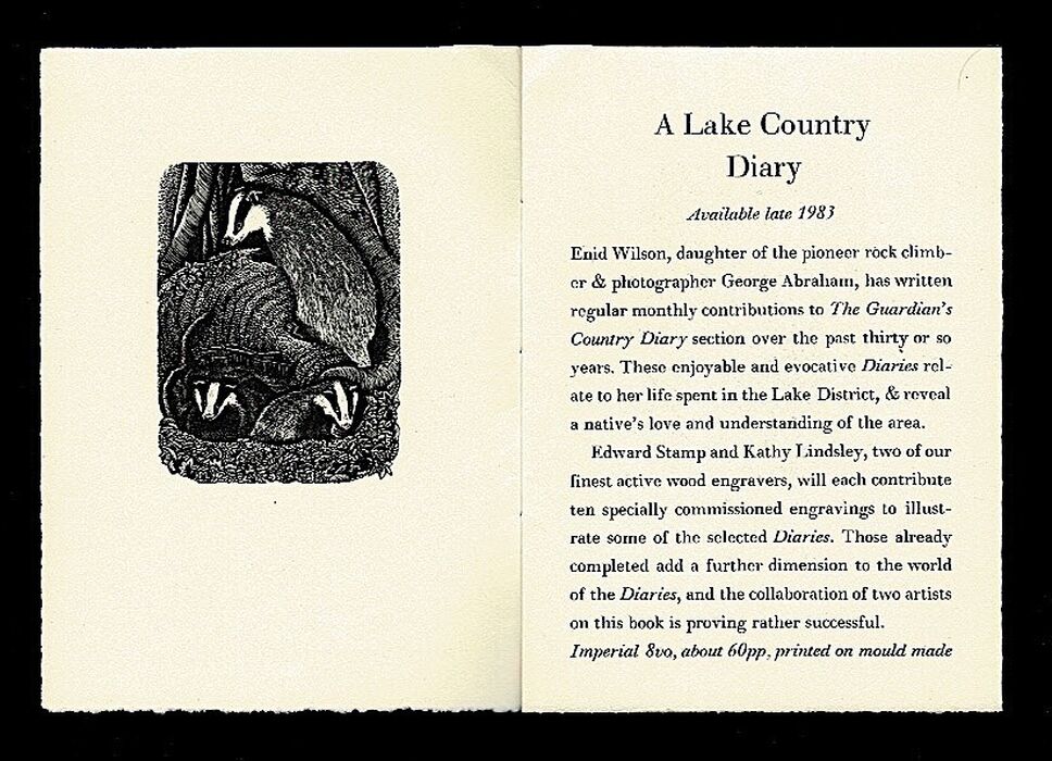 One of an edition limited to 300 copies, printed by hand, of a prospectus announcing the publication of 'A Lake Diary' and 'The Press that villainous Engine', with engravings by Kathy Lindsley and Peter Forster. 5¼" x 3¾", pp.[8], bound with blue thread.