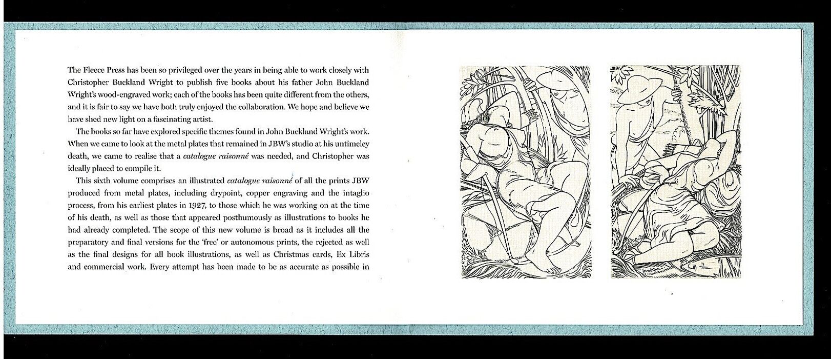 One of a limited edition of 1,500 copies of the prospectus promoting 'Sensuous Lines - A Catalogue Raisonné of the metal plate engravings and intaglio prints of John Buckland Wright'...'now in advanced preparation, and to be published in January 2014..'. Pale blue paper wrappers with white thread binding of the page leaves and black lettering and decoration. 8" x 6", pp. [8] with two illustrated engravings, 'Girl Asleep [No. 1]' and 'Girl Asleep [No. 2]' both unused designs from Cupid's Pastime, 1935.