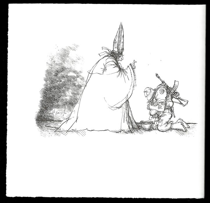 A prospectus promoting the publication of 'The Face of War'. The prospectus reflects the book in terms of size (Quarto, 245 x 250 mm), paper and typeface, being printed on Zerkall paper and typeset in Photina semi bold by Charles Hall. Four pages with a full page cartoon on the second, and a poem ('VII Blessing'), on the third pages and small cartoons on the front and rear.