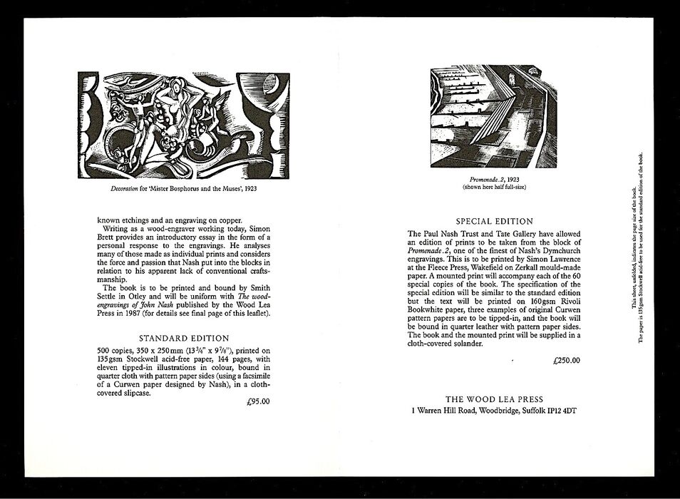 A prospectus announcing the publication of 'The Wood Engravings of Paul Nash', detailing both the Standard Edition and the Special Edition, and including three examples of the engravings (one half size). Printed on 135 gsm Stockwell acid-free paper, 250 x 170 mm, pp. [4]. Also advertising, on the last page, the availability of a few copies of 'The Wood Engravings of John Nash', published in 1987.