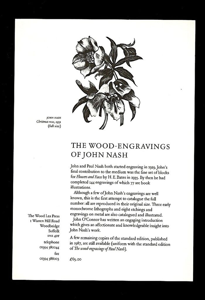 A leaflet, printed and illustrated on both sides, advertising the availability of copies of the standard edition 'The Wood-Engravings of Paul Nash' (1997) and"a few remaining copies" of the standard edition of 'The Wood-Engravings of John Nash' (1987). The John Nash illustration 'Christmas rose, 1931' is full size; the Paul Nash illustration 'Garden pond, 1921' is reduced size. 244 x 170 mm.