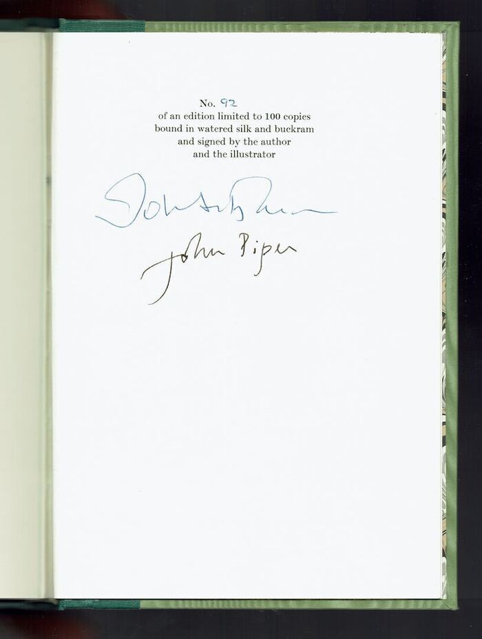 LIMITED EDITION, this copy numbered '92' of an edition of 100 copies which were numbered and SIGNED by both the author and the illustrator. Bound in green watered silk and quarter buckram with marbled endpapers, gilt lettering and ornament to spine, top edge gilt, gilt rolls to junction of buckram and silk. Clear, removable, protective archival cover fitted to the book. Octavo.[2] [1-7] 8-65 [66-68]. Thirty poems.