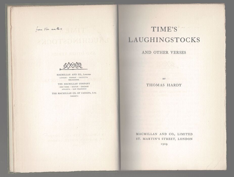First Edition, one of 2,000 copies of the author's third collection of poetry. Sir Frederick Pollock's copy, with his ownership signature to the front pastedown, and his note on the verso of the half-title, 'from the author'. With a handwritten 'With the Author's Compliments' slip loosely inserted. Publisher's olive-green cloth with gilt lettering to the spine and gilt, decorative 'TH' monogram medallion to the front board blocked in gold, all edges untrimmed. Small octavo, [A]6, B-O8, P2, pp.[ii][i-iv] v-x [1-2] 3-208 with four pages of advertisements and press opinions of The Dynasts..