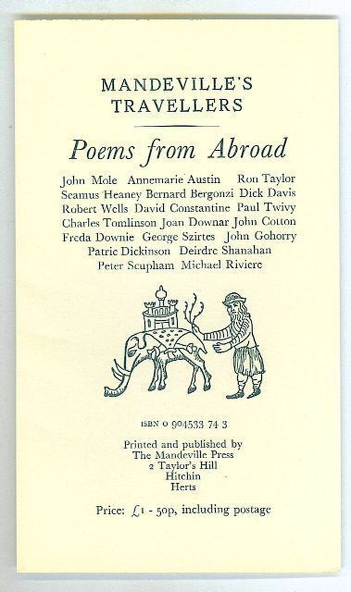 LIMITED EDITION of 300 copies. Illustrated limp card covers. Quarto. pp. [8]. A prospectus for 'Mandeville's Travellers: Poems from Abroad' is laid in. The illustration within the text are drawn from a sixteenth-century woodcut, Sandy's Relation of a Journey, 1673, and a Catalan atlas of 1385. Seamus Heaney contributes 'Stone from Delphi', one of a total of nineteen poems.