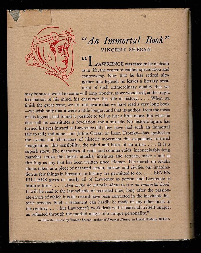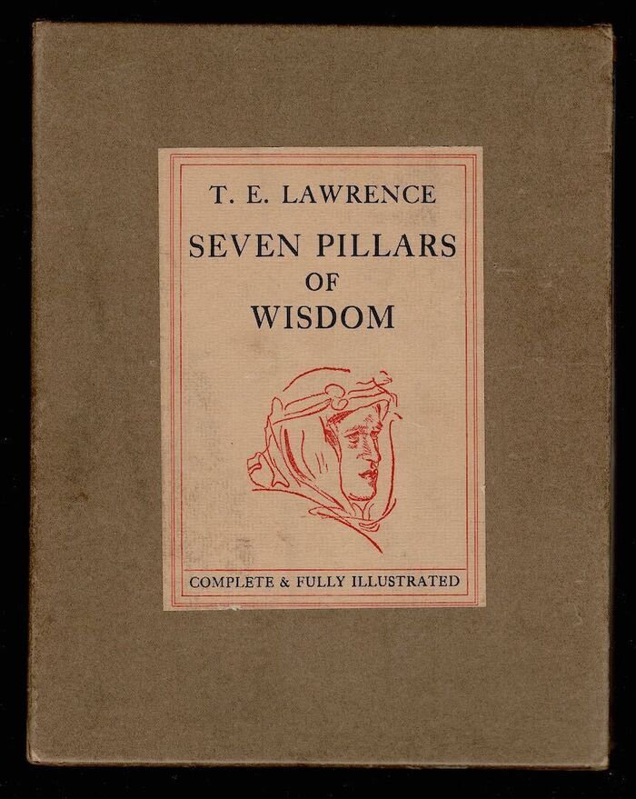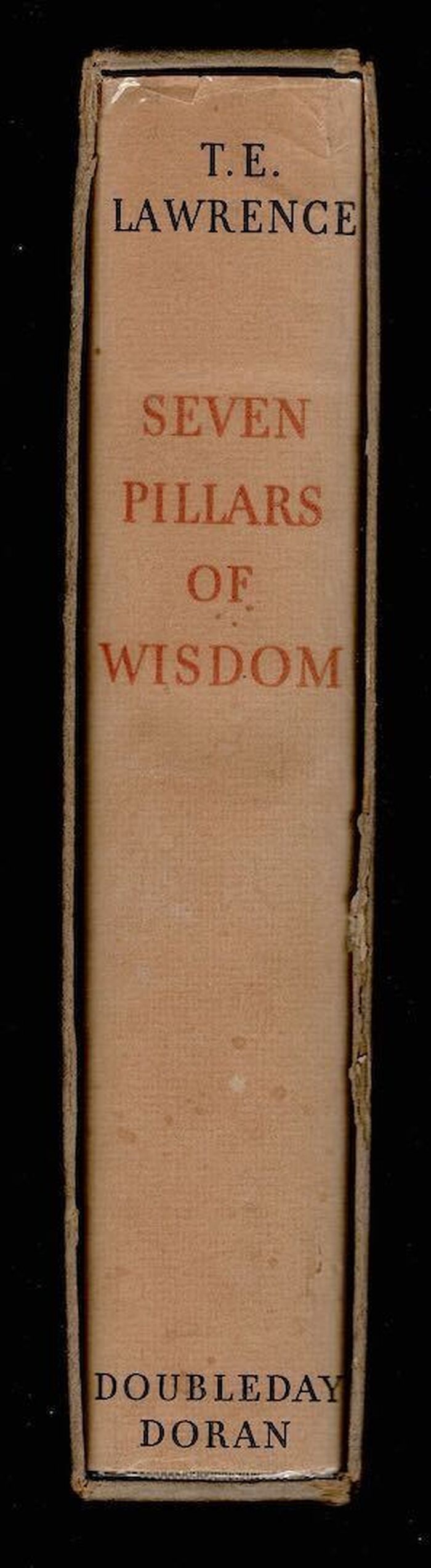 Second American Edition (the first American trade edition), later issue, third state dust wrapper. Publisher's grey brown buckram, on front cover [crossed swords device], gilt lettering to spine, red and yellow head and tail bands, top edge stained red. Clear, removable, archival protective sleeve fitted to the dust wrapper which bears the title in red and a red sketch portrait of Lawrence by Augustus John on front panel, red title to spine and other lettering in black; the rear panel has a red sketch portrait of Lawrence by Augustus John with an extract from the review by Vincent Sheean entitled "An Immortal Book". Housed in a brown card slipcase with title plate attached [red frame with black lettering and a red sketch portrait of Lawrence by Augustus John]. Collation: 25 X 19.5 cm: [1-42]8, 336 leaves, pp. [1-6] 7-672 with 48 plates, 4 maps printed in red and black. Published at $5.00 on 27th September 1935. Complete with a sheet of textual omissions laid in. O'Brien A054.