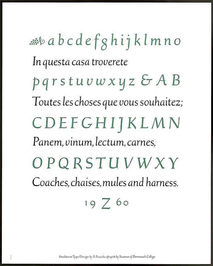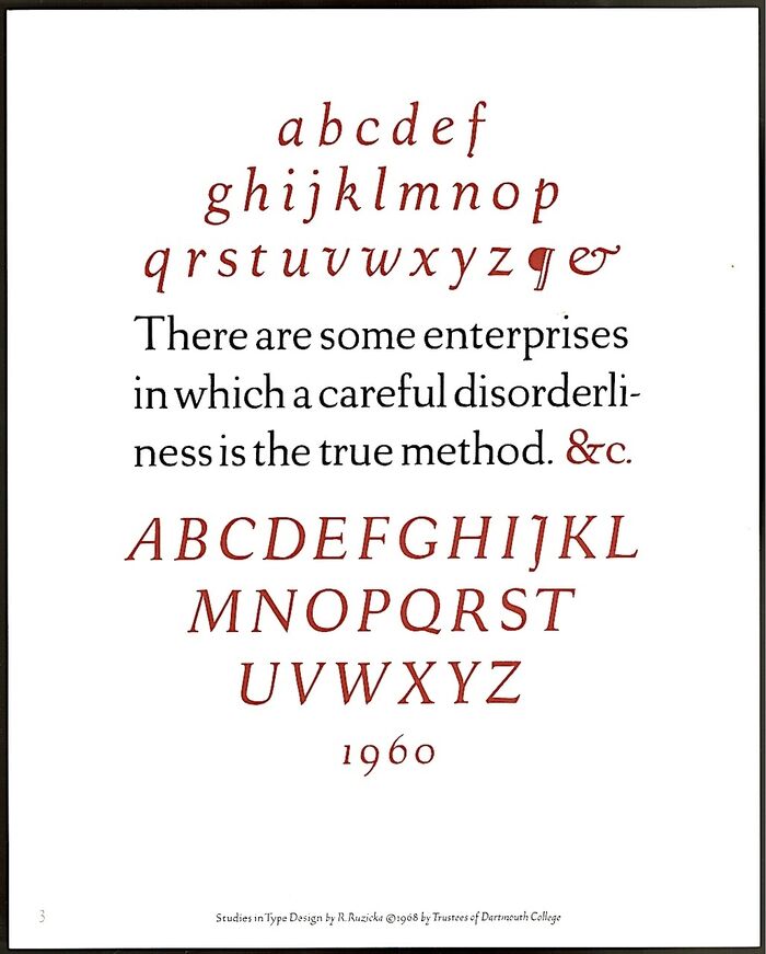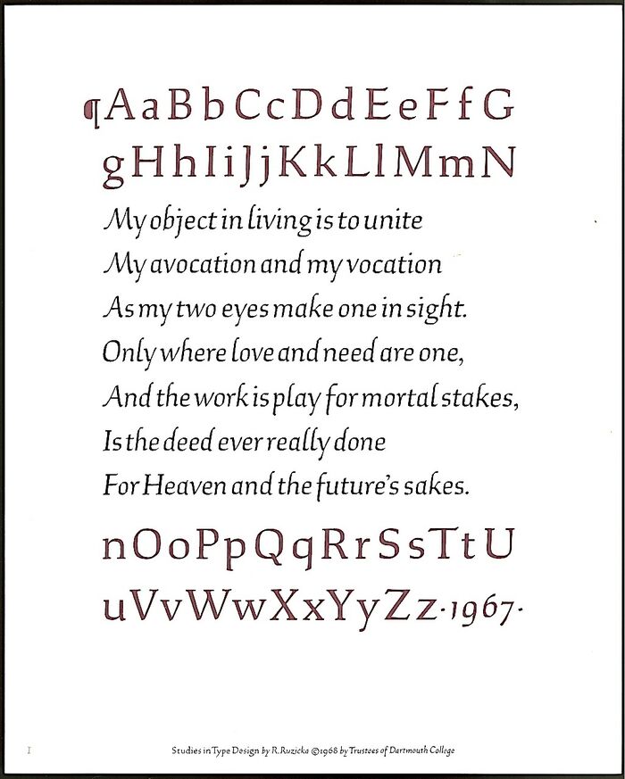 Ten broadsides of author quotations designed by Ruzicka using various alphabets. Each broadsheet is housed in its own printed paper folder, and the ten are housed together in the original cloth covered portfolio with black lettering to the upper board, and a matching slipcase, TOGETHER WITH a 4-page 'title page, introduction and contents' folded sheet. Printed by The Meriden Gravure Company. On the front pastedown of the portfolio is the printed and decorated compliments slip of the American Printing History Association. The broadsheet quotations are by the following authors: 1. Robert Frost, from "Two Tramps in Mud Time". 2. Paul Valéry, "La Feuille Blanche" 3. Herman Melville, Moby-Dick; or, The Whale. 4. Samuel Taylor Coleridge, Biographia Literaria. 5. An inscription found in a guest book of an inn in Chamonix, France. 6. William Shakespeare, Hamlet. 7. Geoffrey Chaucer, The Canterbury Tales, "The Frankeleyns Tale". 8. Walt Whitman, Leaves of Grass, "A Font of Type". 9. Sir Thomas Browne, Religio Medici. 10. Henry David Thoreau, Walden; or, Life in the Woods, Spring.